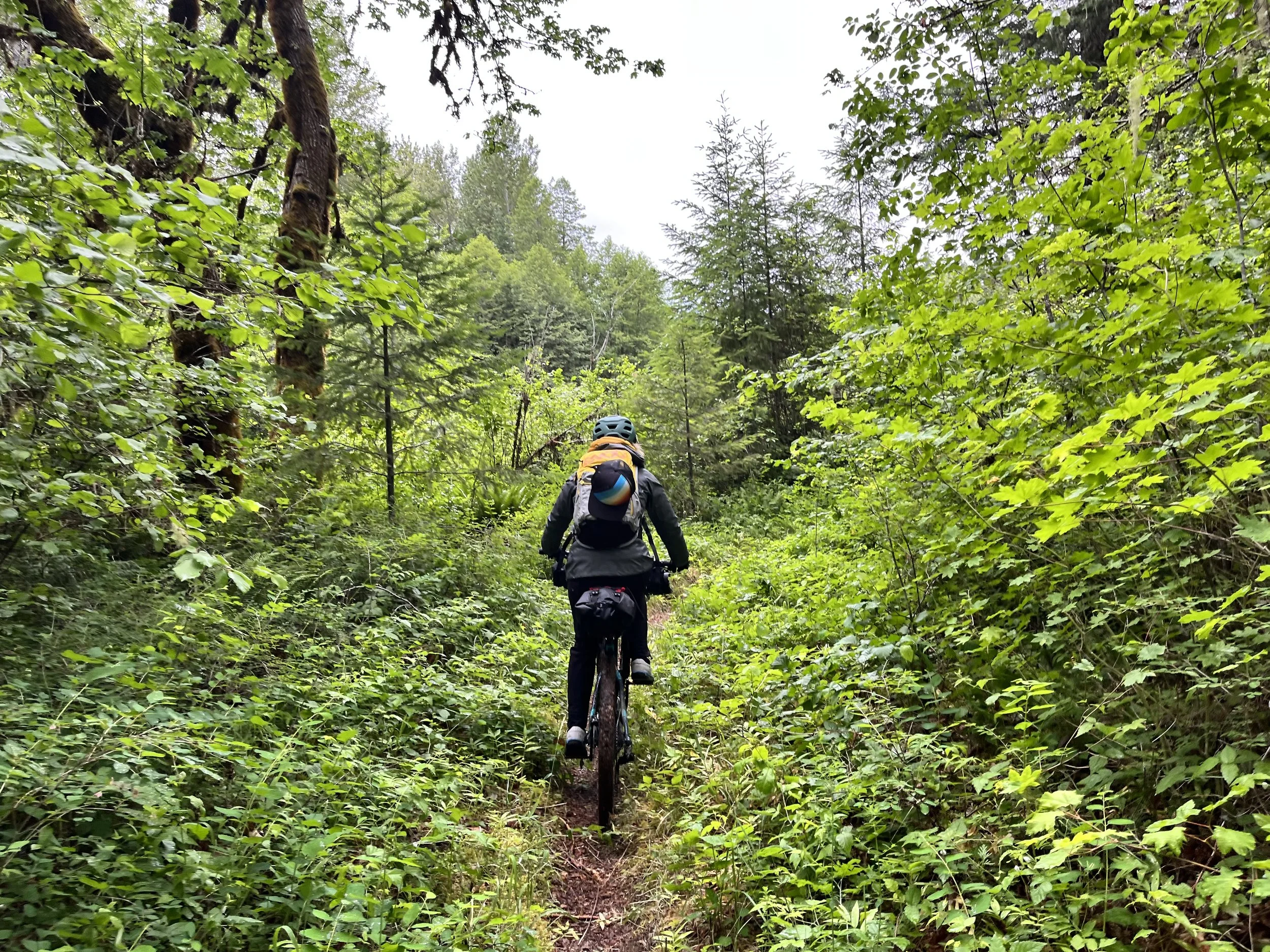 Sunday, we were greeted by a light rain, just in time to make our tents extra…um…foresty as we packed them up. Warm oatmeal and coffee and tea under Douglas fir were the perfect way to fuel up. With camp packed up, Heather explained our options (riding the trail, bouncing back and forth between trail and road, etc.) and we headed out, bundled up against the cold and rain.