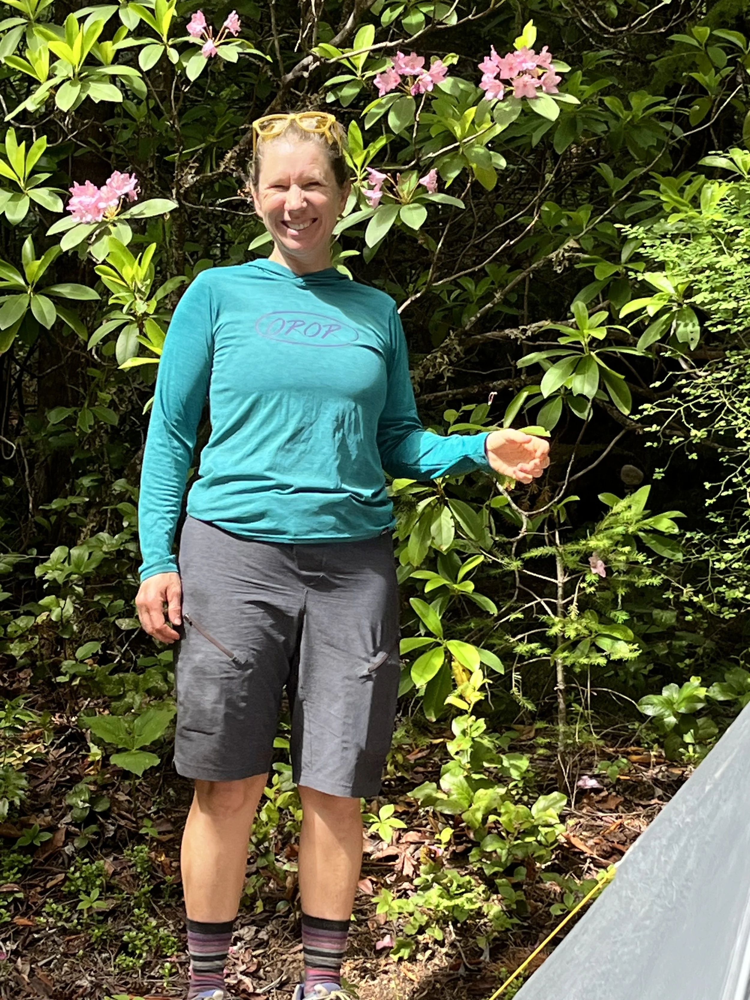We camped at Indigo Springs, where there was apparently a National Mosquito Convention underway. A few quick sprays of repellant and we came to a quick and easy truce with their legions. Tents up, water refilled from Indigo Creek, we decided to explore a bit of the OTT by foot. Everything about that afternoon hike was special. The conversation, the silence, the rush of water, the old-growth trees, the smells, the chirp of birds, so many butterflies, the pops of color, rhododendron, greens of every hue, and dirt and pine needles and leaves and trickling streams and huge walls of rock and mossy boulders and elaborate roots underfoot. We hiked up to Chuckle Springs, where intimate little waterfalls and features dotted the trailside.