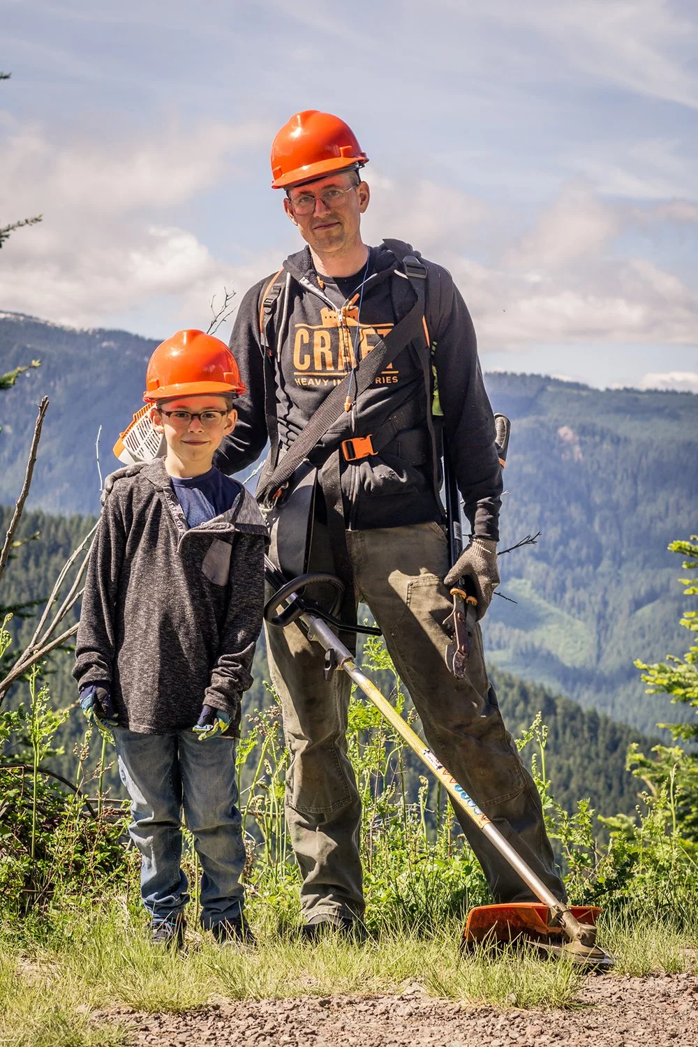 Considering safety, set your child up for success before you leave home. Wear long pants, long sleeve shirts and closed toe shoes. Kid sized bike gloves do double duty as trail work gloves. At the trail work event, model proper use of tools, how to safely carry tools (business end down) and how and why to stay away from power tools. Safety glasses are also recommended, though kids may balk at adding them to the already heavy hard hat.